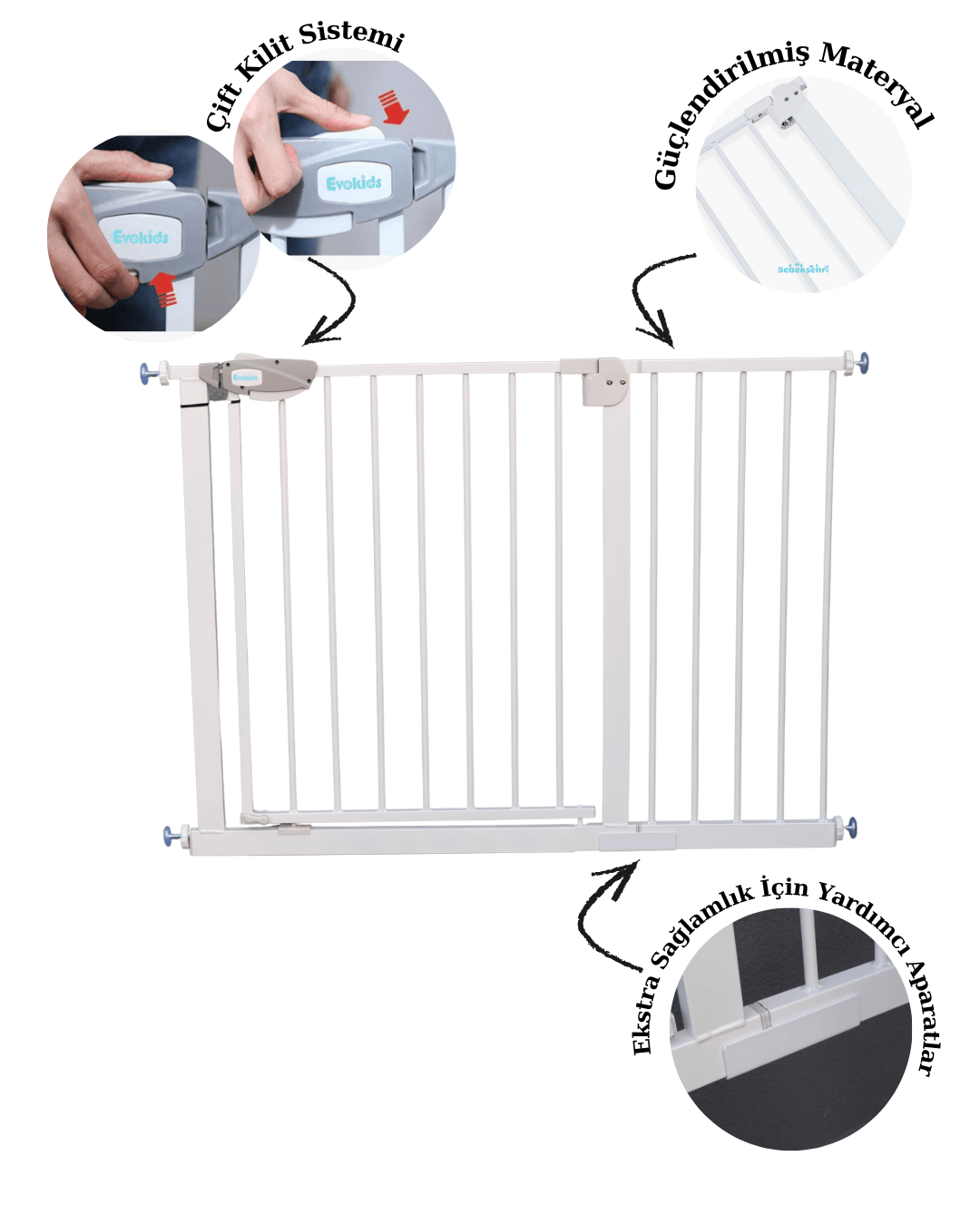 Evokids Çift Kilitli Çocuk Güvenlik Kapısı + 30cm Uzatma Aparatlı Set, ev içi güvenlik gereksinimlerinizi karşılamak üzere tasarlanmıştır.